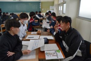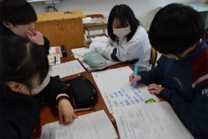 2年生【進路学習②】 2年生の様子 2026年01月15日 1/15(木)に進路学習を行いました。今回は、自分が進学する高校を選ぶ基準について考えました。通学のしやすさや学校の雰囲気などの意見が出ました。各自で考えたことを、グループで共有しました。 【グループ活動などの様子】
