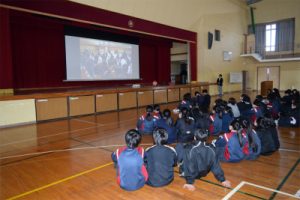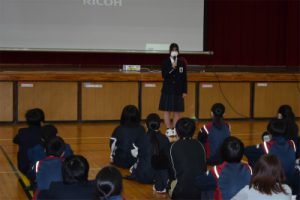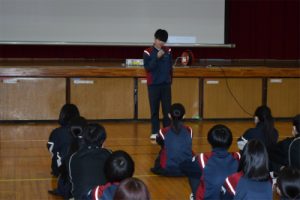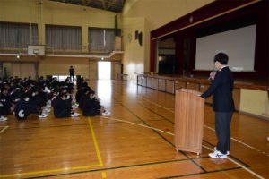 3/24(火)に学年最後となる学年集会を行いました。各クラスの代表が自分のクラスの良い点と改善する点について話をしました。また、学年の先生たち一人一人から話を聞きました。そして、学習面、生活面、進路についての話もありました。子どもたちは真剣な表情で話を聞いていました。